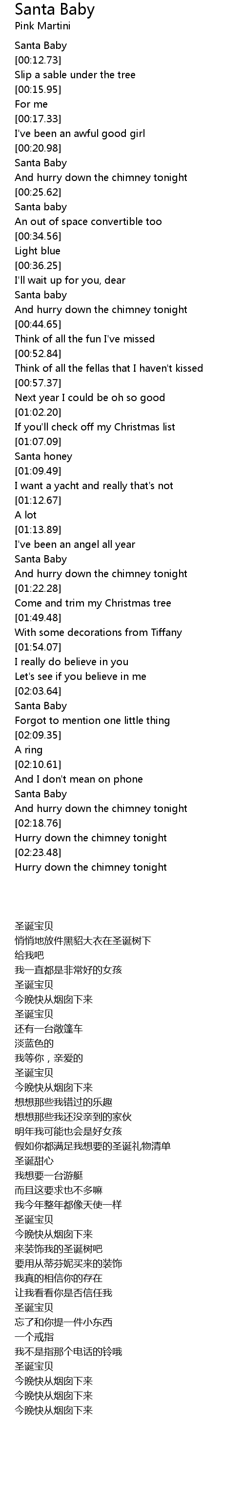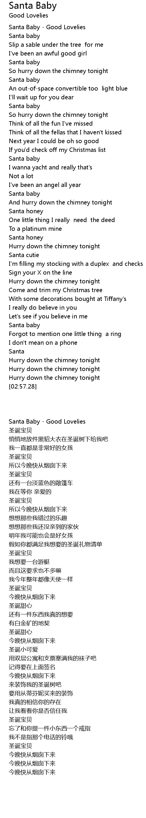 And hurry down the chimney tonight. Santa baby slip a sable under the tree for me. Santa baby just slip a sable under the tree for me Been an awful good girl Santa baby so hurry down the chimney tonight Santa baby a 54 convertible too light blue Ill wait up for you dear Santa baby so hurry down the chimney tonight Think of all the fun Ive missed Think of all the fellas that I havent kissed Next year I could be just as good If you check off my Christmas list Santa.