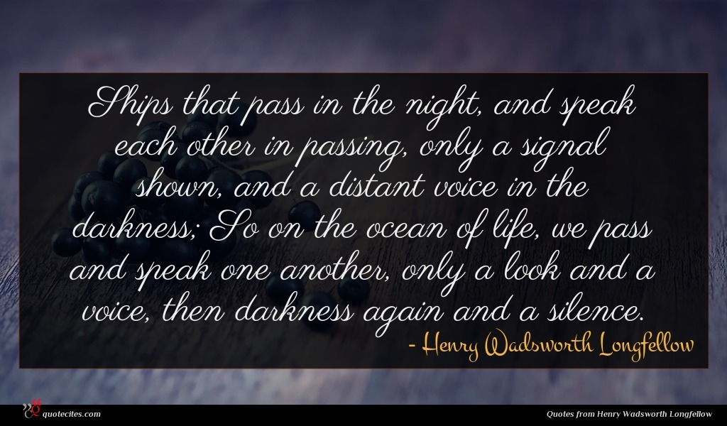 Ships that pass in the night and speak each other in passing Only a signal shown and a distant voice in the darkness. Henry Wadsworth Longfellow. Ships that pass in the night and speak each other in passing only a signal shown and a distant voice in the darkness So on the ocean of life we pass and speak one another only a look and a voice then darkness again and a silence-Henry Wadsworth Longfellow. Only a signal shown and a distant voice in the darkness. It is written in Tales of a Wayside Inn by Henry Wadsworth Longfellow in 1863 where it reads. Then darkness again and a silence. Henry wadsworth longfellow life quotes ships that pass in the night liberal ships that pass in the night you henry wadsworth longfellow about life. This line originates from the poem The Theologians Tale in Henry Wadsworth Longfellows Tales of a Wayside Inn. Henry Wadsworth Longfellow Quote.