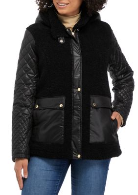 Via spiga mixed media hooded walker coat. Stylishly trimmed with faux-leather this cozy walker coat from Via Spiga is perfect for your next night out on the town. Stylishly trimmed with faux-leather this cozy walker coat from Via Spiga is perfect for your next night out on the town. Black faux leather belt.